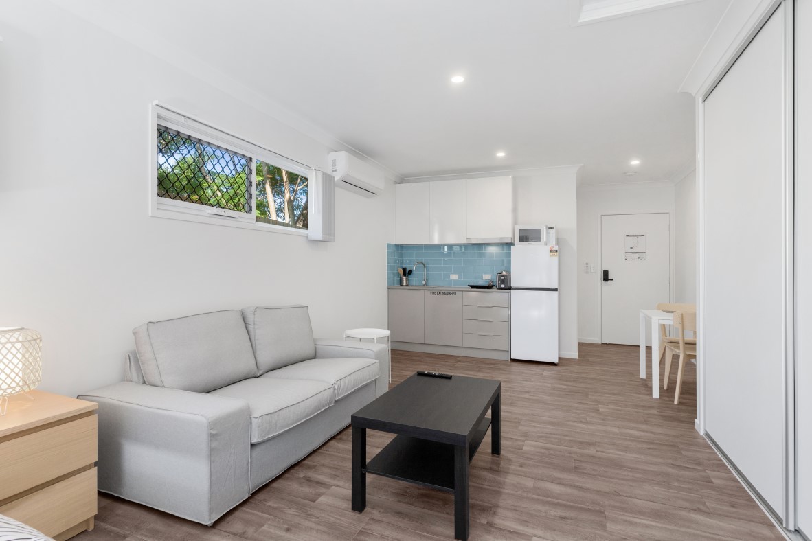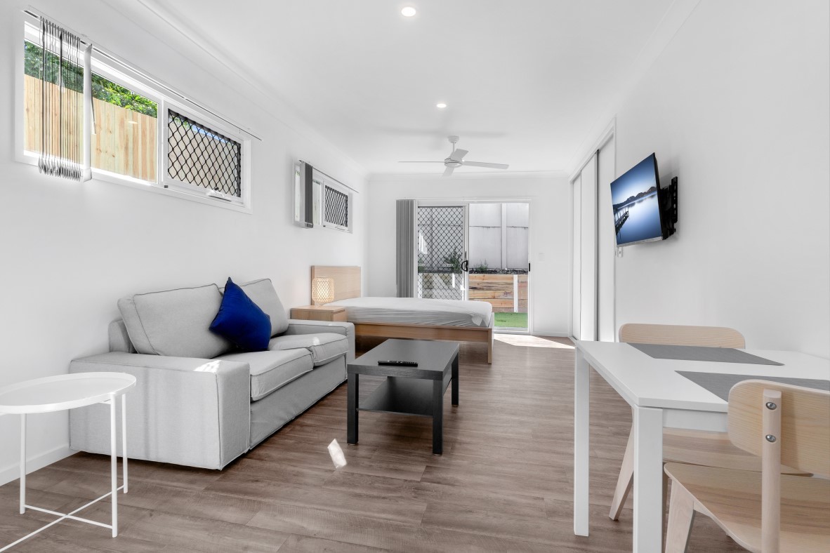 Located at ground level opening out to a fully fenced, private courtyard facing the rear of the property, fully furnished, spacious open plan living and bedroom area. Kitchenette, ensuite, fully air conditioned with ceiling fan and screens.