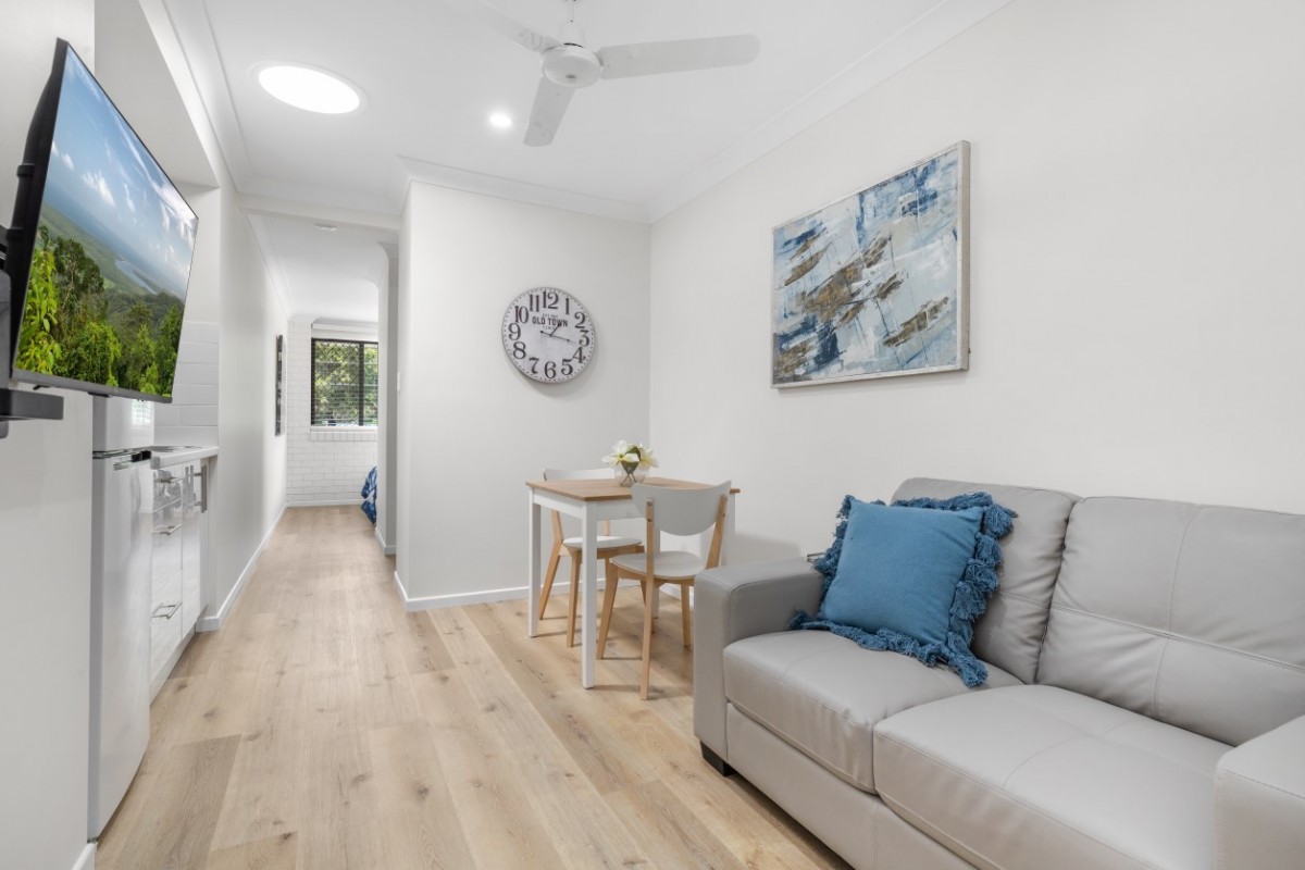 Located upstairs facing the back of the property this studio is secure, fully furnished, open plan living and kitchenette areas plus bathroom. Air conditioned for your comfort with a ceiling fan and security screens.