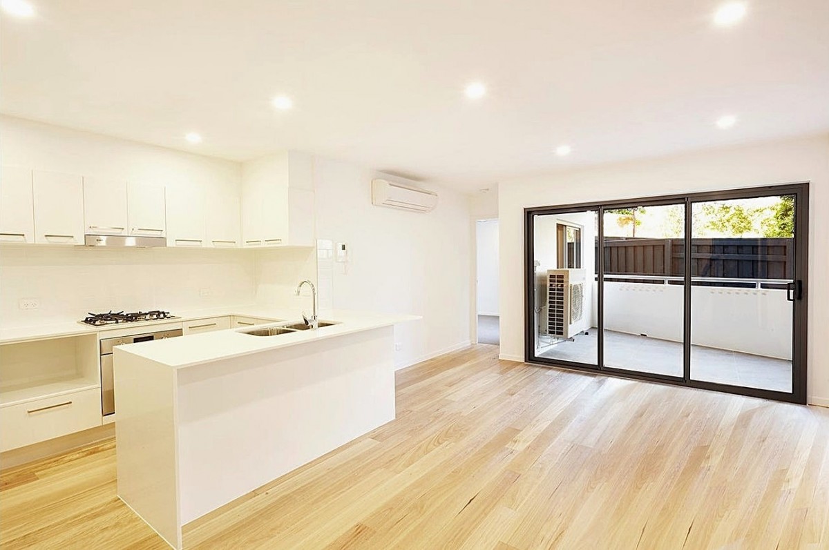 Open plan living space with Blackbutt timber flooring leading out to a balcony, stylish, gourmet kitchen with stone bench tops, ILVE gas cooktop, dishwasher and loads of storage space.