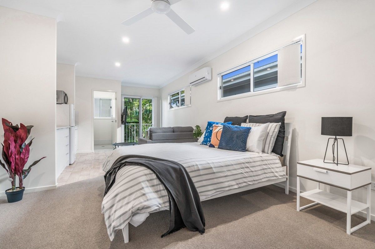 Facing the front of the property this studio is spacious, open plan and air conditioned with a kitchenette, ensuite, screens, ceiling fan and balcony.