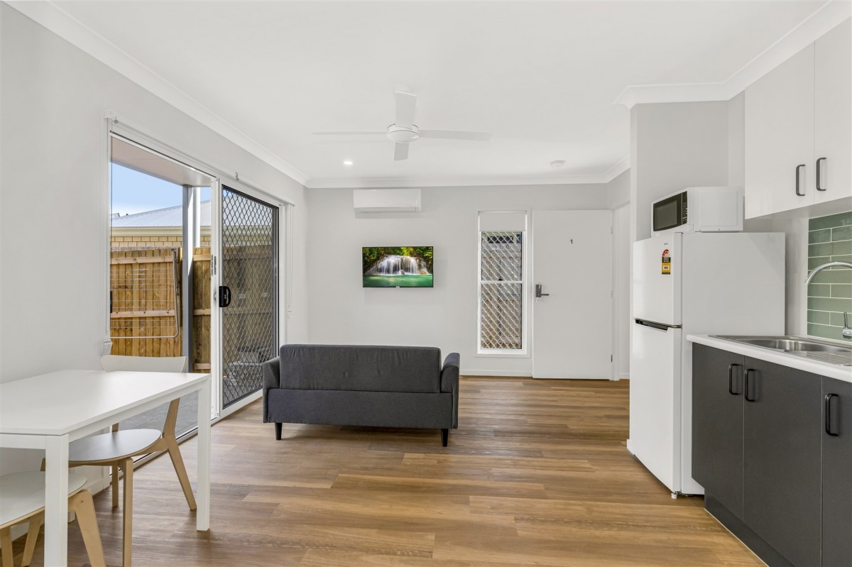 Large ground floor unit with a private fenced courtyard facing the rear of the property. Fully air conditioned, with a ceiling fan, security screens, kitchenette, bathroom and fully separated bedroom with spacious built in robes.